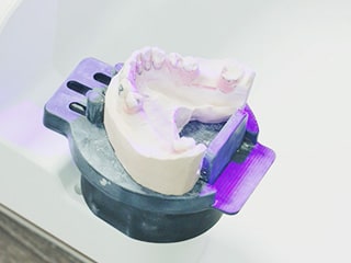 义齿支架的铸造工艺分为传统铸造和3D扫描数字化设计 — CNC数控切削工艺。夕阳美口腔采用3D扫描数字化设计 — CNC数控切削工艺,支架数据通过电脑输出,纯钛材料在支架切削过程中未经高温氧化,制作出的支架数据精确,轻薄、光滑,与口腔组织密贴性较好。